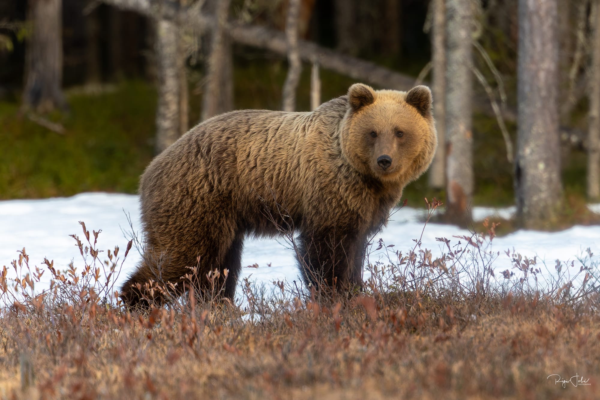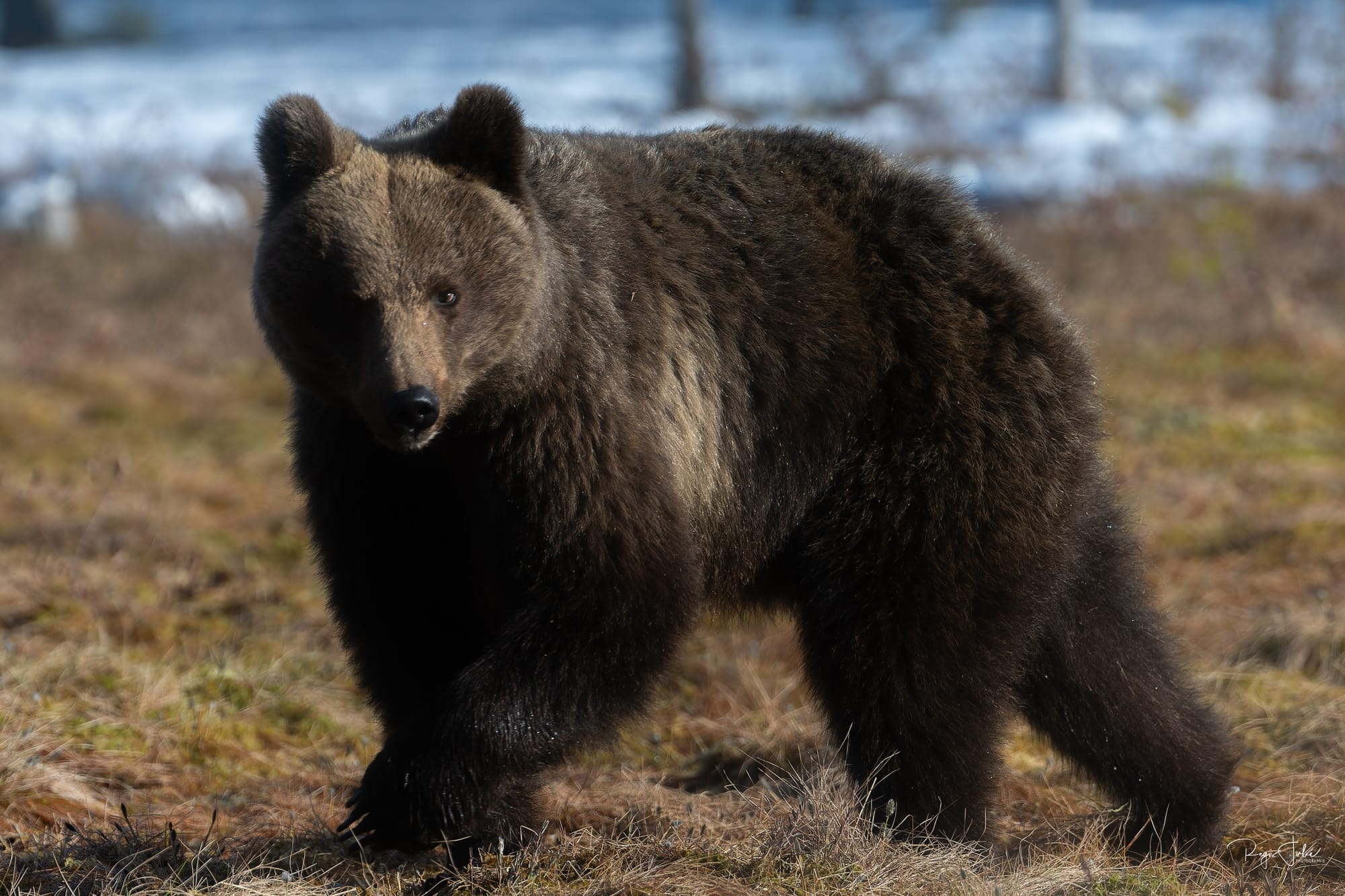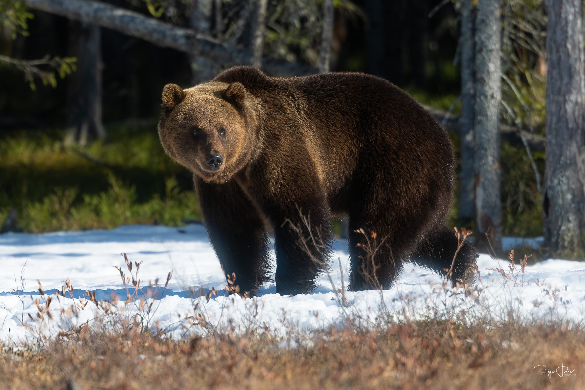 Avec ses vastes forêts boréales, la Finlande offre un habitat idéal pour l'ours brun (Ursus arctos). Selon les dernières estimations de l'agence finlandaise pour la faune sauvage, la population d'ours brun dans le pays s'élève à environ 2 000 individus. C'est l'une des plus importantes populations d'Europe.