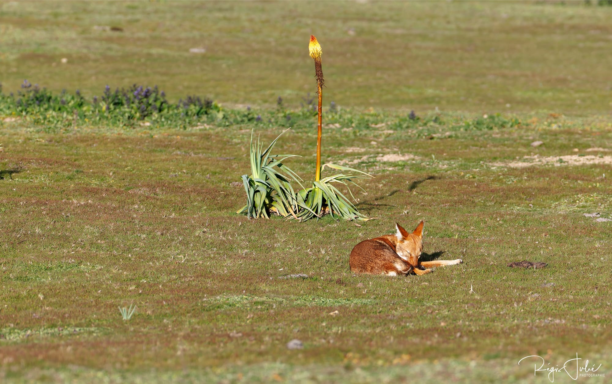 À cette époque de l'année, les paysages sont verdoyants et fleuris, avec la splendide Kniphofia, dont le loup, tout comme les enfants, apprécie le nectar.