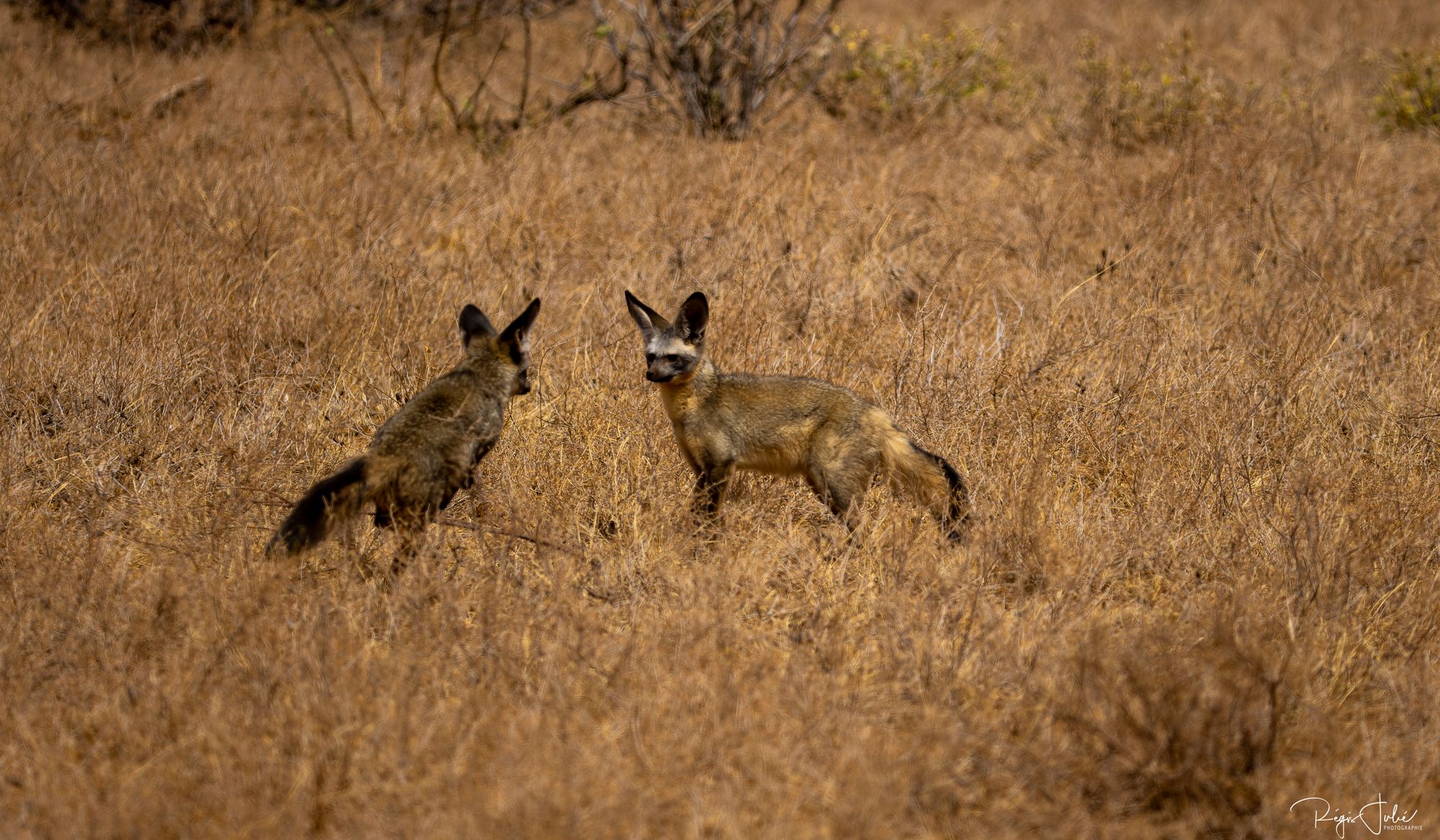 Nous avons eu la chance de pouvoir observer, grâce aux yeux de lynx de notre guide, un octocyon ou renard à oreilles de chauve-souris, Cet animal très craintif s'enfuit généralement très vite quand il est démasqué.